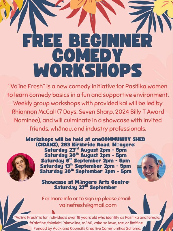 Va’ine Fresh is a new, free programme for Pasifika women to learn comedy basics, led by Cook Islands Māori/Papa'ā comedian Rhiannon McCall. The workshops will focus on finding individuals' comedic voice, being comfortable on stage, and then devising a character or short stand up set to present at a showcase.